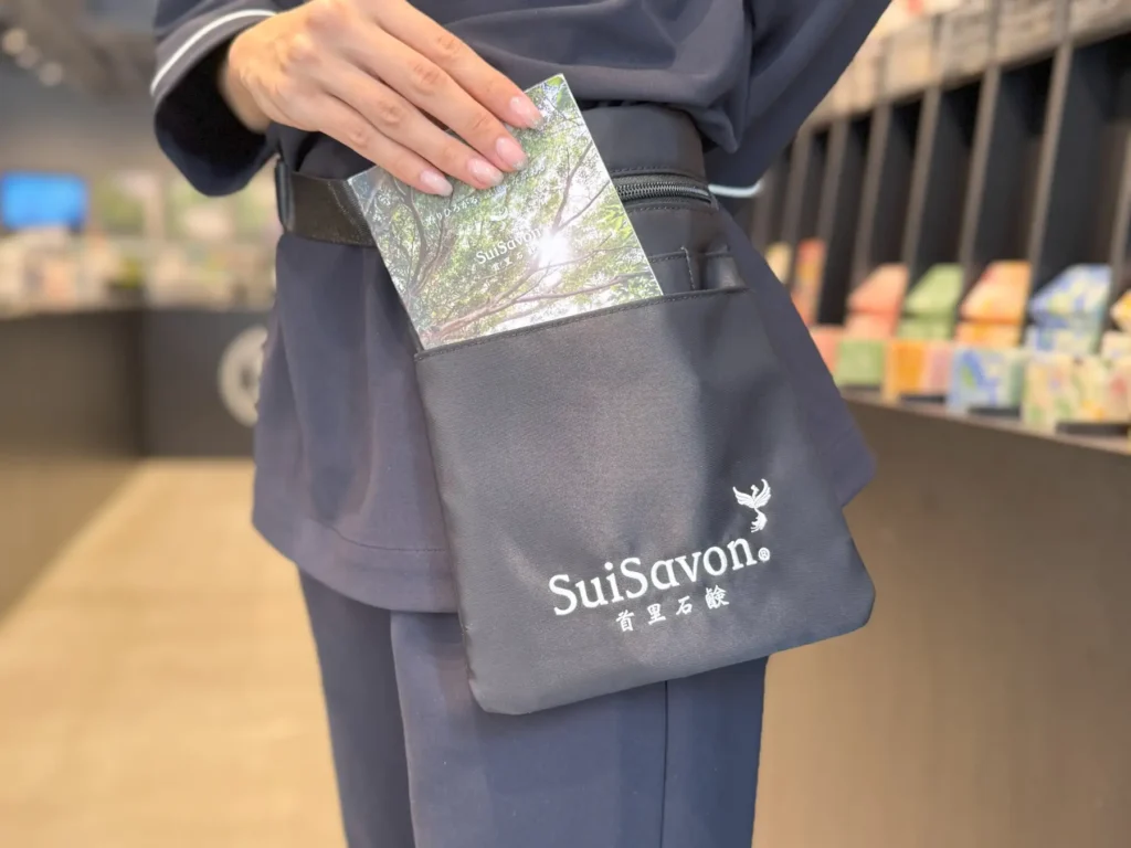 また、今回は店頭作業の際に活用できる首里石鹸様の刺繍入りウエストポーチも新たに作成し、店頭作業の効率化とユニフォームとのスタイリングバランスを意識しております。